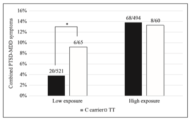 创伤后应激障碍(Posttraumatic stress disorder,PTSD)和抑郁是个体在经历创伤性事件后最常出现的两种心理问题。前期研究发现,个体在经历创伤事件后会呈现不同的创伤后应激障碍-抑郁症状共存模式,即低症状、PTSD症状为主、抑郁症状为主以及PTSD合并抑郁症状。理解这种创伤后症状表现模式异质性的生物学基础对于创伤相关心理疾病的早期筛查和后期精准化干预都有着十分重要的意义。但目前仍未有足够的实证研究关注到这一问题。 前期研究发现PTSD与抑郁的共病受到遗传学因素的影响,提示了遗传学研究可能为解释PTSD-抑郁症状共存模式的异质性提供重要证据。 FK-506结合蛋白(FKBP5)基因能够调节糖皮质激素受体的敏感性,进而影响下丘脑-垂体-肾上腺(HPA)轴的活性,因而参与调节应激相关的心理过程。之前大量的研究分别报道了FKBP5基因与创伤暴露的基因-环境交互作用对PTSD和抑郁的影响。因此FKBP5基因是研究创伤后心理症状表现模式异质性遗传学基础的理想候选基因。 中国科学院心理健康重点实验室王力研究组在之前对成人地震幸存者PTSD-抑郁症状共存模式研究工作的基础上,对其遗传学基础进行了探索。在1140名成人地震幸存者中检验了FKBP5基因的四个重要的单核苷酸多态性(SNP)的基因环境交互作用以及单倍型对PTSD-抑郁症状共存模式的影响。 研究结果显示:该样本中呈现出了低症状、PTSD症状为主、抑郁症状为主和PTSD合并抑郁症状四种症状共存模式。将PTSD合并抑郁症状组与低症状组、PTSD症状组和抑郁症状组分别进行比较时,FKBP5基因rs9470080与地震相关创伤暴露的交互作用显著(见表1)。 表1 FKBP5基因rs9470080位点与地震相关创伤暴露基因-基因交互影响PTSD和抑郁共存症状模式 在低创伤暴露时,rs9470080 TT基因型的携带者更容易发展出PTSD合并抑郁的症状模式,而高创伤暴露时,不同基因型发展出PTSD合并抑郁症状的风险没有显著差异(见图1)。进一步单倍型分析发现,FKBP5基因rs3800373-rs9296158-rs1360780-rs9470080的单倍型A-G-C-T的携带者更容易发展出PTSD合并抑郁的症状模式。 图1 FKBP5基因rs9470080位点与地震相关创伤暴露基因-基因交互影响PTSD合并抑郁症状的风险