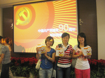 6月8日上午,在共青团中国科学院协作一片于微生物所展览厅内举办的以“凝心聚力促发展,创先争优展风采”为主题的纪念建党90周年知识竞赛活动中,心理所研究生尚俊辰、陆丽萍、苏园林三人在团委副书记吴坎坎的带领下组成的心理所代表队夺得了第三名。