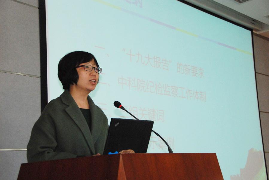心理所党委副书记、纪委书记、副所长陈雪峰做了题为《学习贯彻党的十九大精神切实履行监督执纪问责的职责》报告,她紧密结合自身学习贯彻十九大会议精神体会,从十九大报告提出的新要求谈起, 结合思想建党、制度治党,介绍了党内法规、中科院纪检监察工作体制,详细阐述了“党风廉政建设与反腐倡廉建设、’树木’与’森林’、四种形态”的含义,并结合5个警示案例和7个反腐倡廉重点领域为大家上了一场生动的廉政党课。她希望经过全体同志努力,大力推进全面从严治党,在研究所营造风清气正的政治生态和创新生态。
