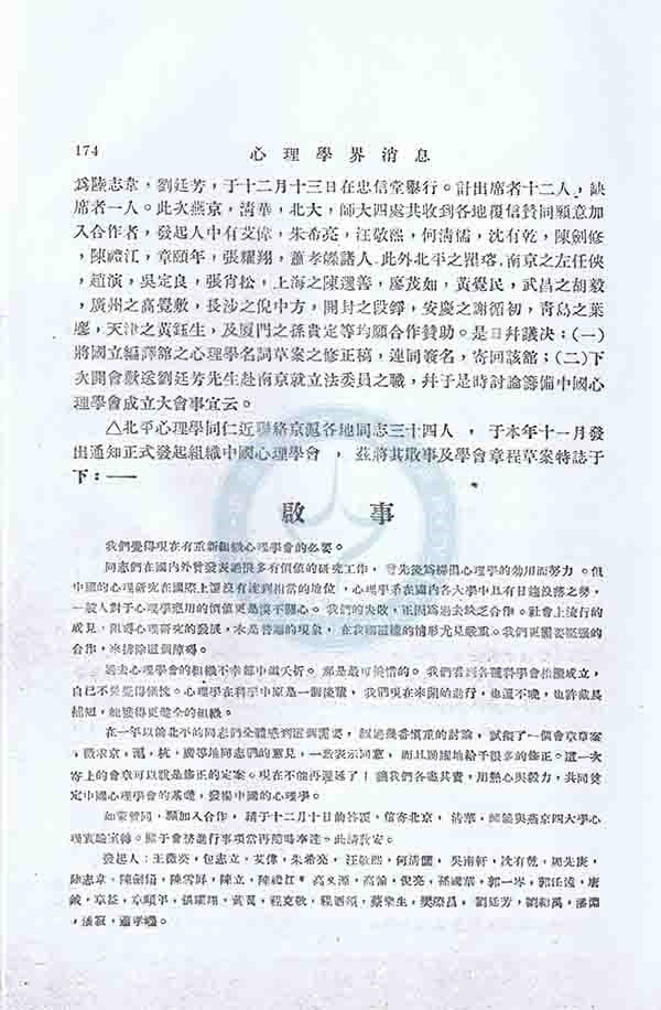 在一年前北平的同志们全体感到这个需要,经过几番慎重的讨论,拟了一个会章草案,征求京、沪、杭、广等地同志们的意见,一致表示同意,而且踊跃地给予很多的修正。这一次寄上的会章可以说是修正的定案。现在不能再迟延了!让我们各尽其责,用热心和毅力,共同奠定中国心理学会的基础,发扬中国的心理学。