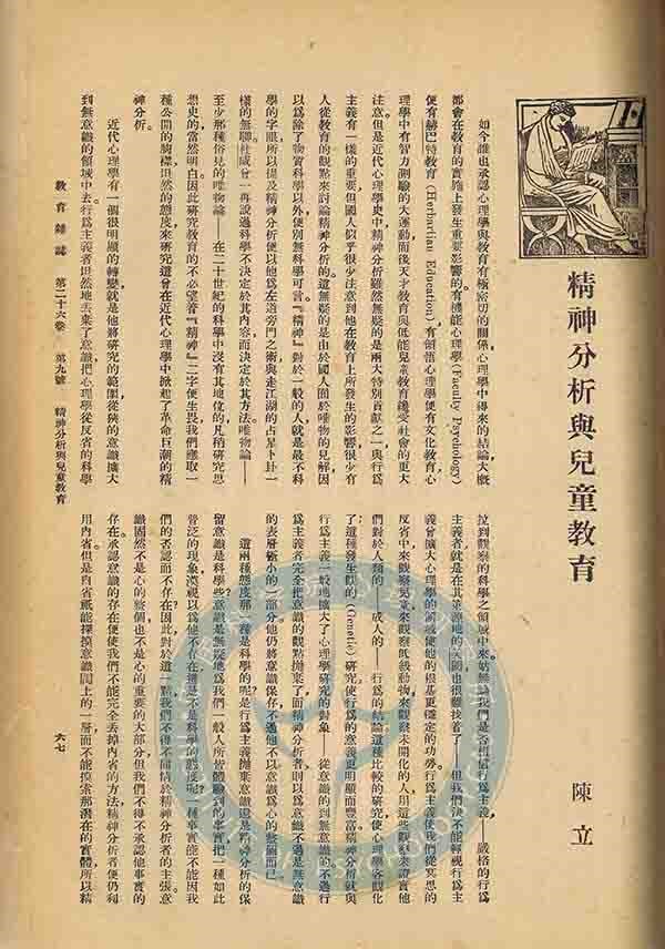 陈立1936年在《教育杂志》上发表的论文“精神分析与儿童教育”