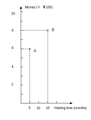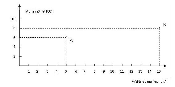 在实验1中,研究者让被试评价两类奖学金的吸引力,一类奖学金的金额大但等待时间久,另一类则金额小但等待时间短。通过改变图形表征中刻度大小(如下面图1和图2所示),实验操纵了图形直观表达的属性突出性,而传递的信息本身没有改变。在图1中,更凸显了等待时间这个属性,而图2中,更凸显了奖学金的数量这个属性。实验对图形版本采用组间设计,结果发现,相对于图形2,图形1条件下被试对A类奖学金评价更高。这说明在图形表达的情形中,即使语言描述保持不变,直观的图形感知也会影响人们的评估。实验2和实验3进一步在多种条件下证实了实验1结果的普遍性。