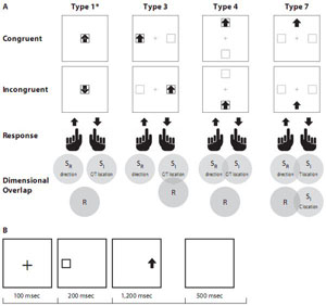 面对现代社会大量而复杂的信息,人们往往需要控制注意过程来处理冲突和解决问题。大量研究表明,由于“刺激—刺激(S-S)”以及“刺激—反应(S-R)”的不协同所造成的干扰,存在着多种形式的注意控制效应,其中最广为人知的是Stroop冲突效应、西蒙(Simon)位置效应、和Posner线索提示效应。根据美国著名认知心理学家Kornblum等人提出的维度重叠理论(DimensionalOverlap Theory),只要刺激集与刺激集,或刺激集与反应集存在特征维度上的相似性,便会为不协同性效应提供基础。