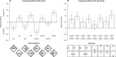 在实验一中,研究者采用了任务西蒙颜色Stroop任务(Simon-color-Stroop task)(如图1),要求被试对菱形中的三角形的颜色做出反应,而忽略菱形中的词语和三角形的直角指向。结果发现,被试的行为反应相对独立地受不同重叠维度的影响。当只存在一种维度重叠时,加工易化和干扰效应都很显著。并且,当S-S和S-R都存在维量重叠时,二者出现了叠加的效应:被试在双重易化条件下(如图3,SSCSRC)的反应时显著缩短,并且与两个单独易化效应(SSC和SRC)相加的效果相等。同样的模式在干扰效应中也存在。