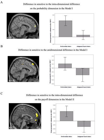 研究发现,在偏好决策任务中,冲突相关的脑区(背内侧前额叶)的活动性受到两个选项维度(概率和报酬)内差异的显著影响,而与两个选项的总效用维度差异不相关。与之相反,在判断决策任务中,背内侧前额叶的活动性受到两个选项的总效用维度差异的显著影响,而与维度内差异不相关。根据我们提出的补偿性-非补偿性的冲突反应假设,这一发现表明,人们在根据自己偏好进行决策的时候并不遵循补偿性规则。此外,研究人员还发现在偏好决策时的冲突强度大于判断决策下的冲突强度。这暗示,在判断决策过程中,决策冲突通过补偿性计算的方式解决了;而在偏好决策过程中,由于决策冲突没有被解决,被试一直感受到强烈的冲突。