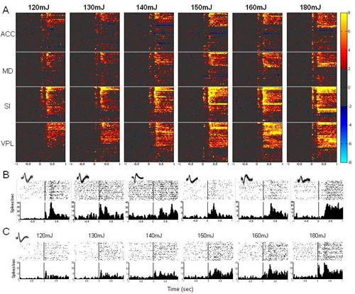 为此,中科院心理健康重点实验室罗非研究员、王锦琰副研究员及其团队利用清醒动物神经细胞群单位放电多通道同步记录技术,在大鼠的初级躯体感觉皮层(SI),丘脑腹后外侧核(VPL),前扣带皮层(ACC)以及丘脑背内侧核(MD)埋置电极,研究疼痛的内外侧通路对伤害刺激强度的编码特征。其中SI和VPL位于疼痛加工的外侧通路,而ACC和MD位于疼痛加工的内侧通路。在给予大鼠后肢足底六个递增强度的伤害性激光刺激同时,监测这四个脑区,随后分析其神经元个数、放电频率以及整体放电数这三种编码模式。