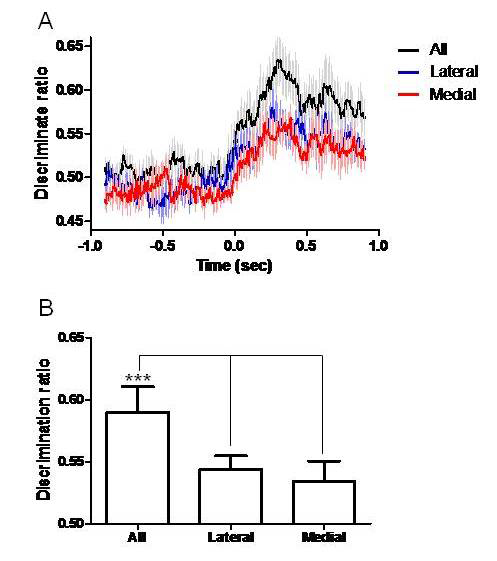 图3 判别分析证明内外侧通路神经元群对不同刺激强度的分辨能力相同