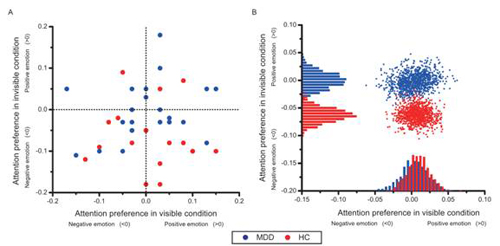 (A)MDD患者(蓝色点)和对照组被试(红色点)的注意偏向的个体结果。横轴表示意识上注意偏向,数值的正、负分别对应正性情绪和负性情绪。纵轴表示意识下注意偏向。(B)对两组被试多次重采样(bootstrap)后的统计分析结果显示,对照组被试的意识下更注意负性情绪(显示于纵轴),而MDD患者则没有出现明显的意识下注意偏向。两的被试群体在这一特征上出现较明显的分离。