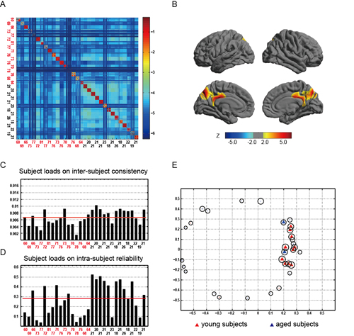 图1. gRAICAR算法在静息态功能磁共振数据中发现由后扣带回和楔前叶皮层组成的脑功能网络(如B所示)。该功能网络只在部分被试中具有高度一致性(如A所示,可复制性矩阵所示)。gRAICAR基于非参数检验方法据此检测出被试亚组(如C、D所示),并揭示所有被试间的相似关系(如E所示)。经分析后验证,gRAICAR发现的被试分组与被试年龄特征高度一致(见A标明的被试年龄、E标明的被试年龄分组)。