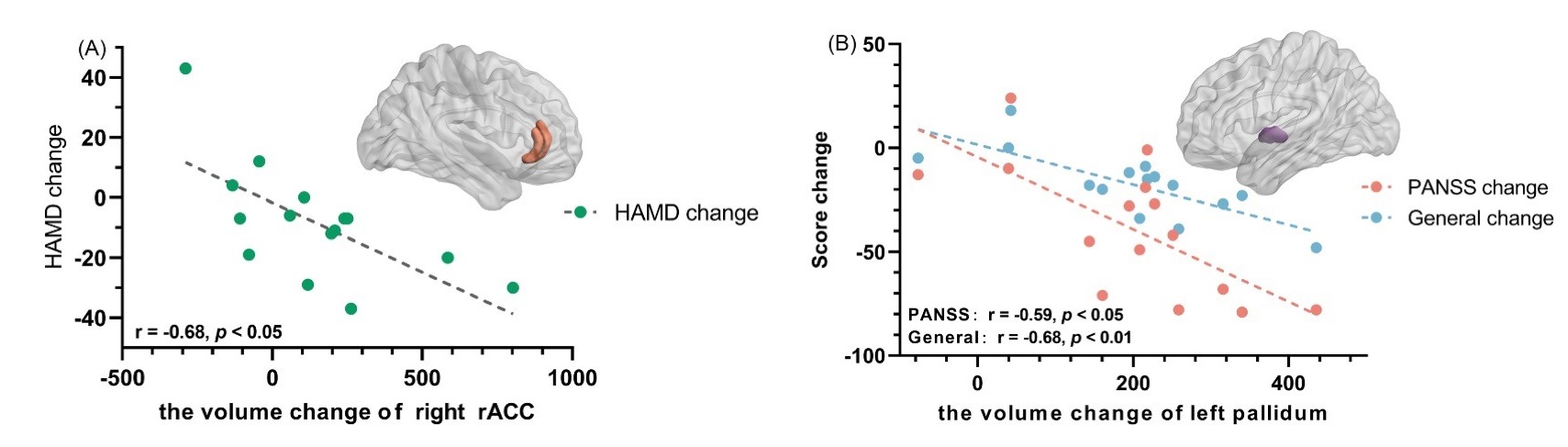 结果仅在抑郁组患者中发现,12周利培酮治疗缓解了患者的抑郁症状和精神分裂症症状,治疗后吻侧前扣带皮层(rostral anterior cingulate cortex)和苍白球体积显著增加。与假设相一致的是,抑郁组中抑郁症状缓解和腹侧扣带回体积增加存在负相关,精神分裂症症状缓解和苍白球体积增加存在负相关。