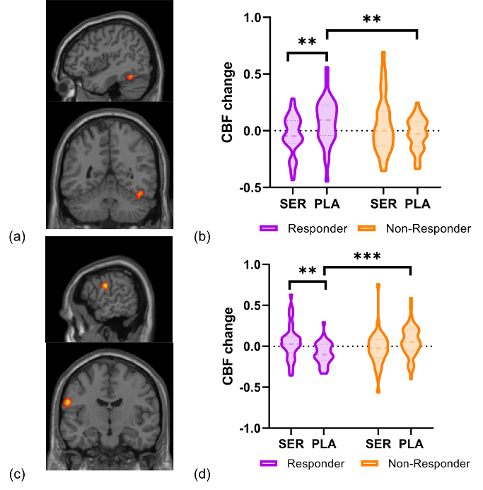 图1:治疗方式与疗效的交互效应。舍曲林反应组和非反应组、安慰剂反应组和非反应组在颞叶(a)与中央后回区(c)存在显著的治疗×时间交互作用。(b)和(d)显示了治疗早期脑血流量变化在舍曲林反应组和非反应组之间以及安慰剂反应组和非反应组之间的事后t检验结果,星号**代表p < 0.01,***代表p < 0.001。