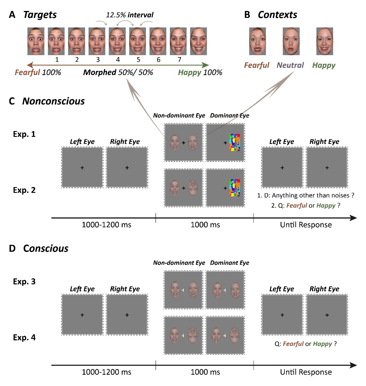 对此,中国科学院心理研究所蒋毅研究组的研究人员开展了一项研究,探讨了情绪效价与意识水平在情绪信息整合中的作用。研究采用心理物理法,以恐惧与快乐渐变融合的模糊面孔为目标刺激(图1A),以带有恐惧、快乐和中性表情的他人面孔作为情境刺激(图1B),考察周围面孔情境对目标面孔知觉的影响。同时,通过在不同实验中改变情境面孔的可见性,操控观察者的意识水平:在无意识条件下(图1C),借助连续闪烁抑制(continuous flash suppression, CFS)范式将情境面孔掩蔽至不可见,从而使其无法被察觉;在有意识条件下(图1D),情境面孔处于可见状态。