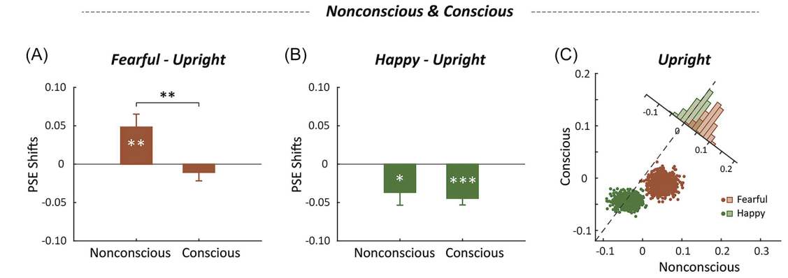 图2. 不同意识水平下恐惧和快乐情境影响面孔情绪知觉的结果图