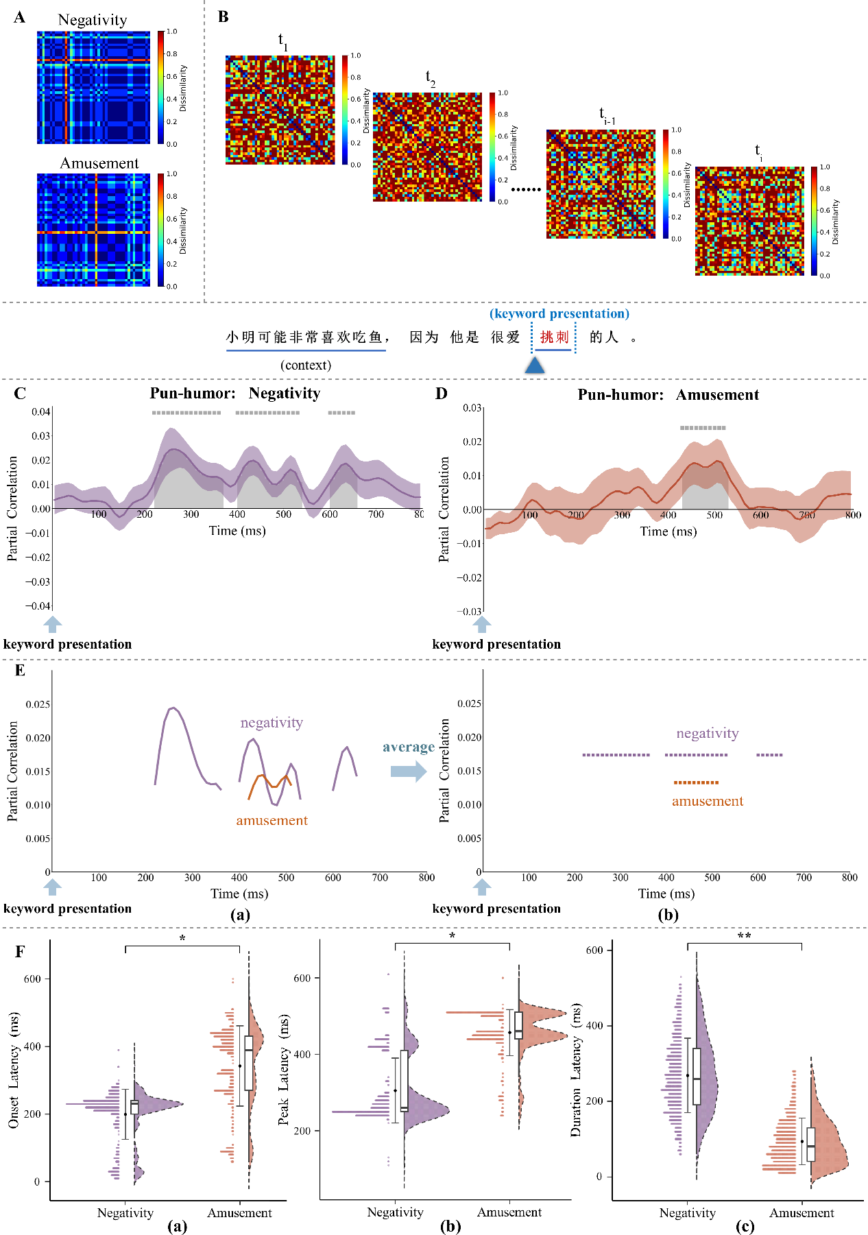 A,负面感(negativity)与愉悦感(amusement)的行为表征差异矩阵(RDM);B,脑电数据在各个时间点上的表征差异矩阵(RDM);C–F,RSA分析结果,时间零点表示关键词呈现的起始时刻