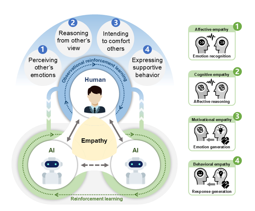 为了达成以上目标,人类对AI的共情倾向,以及AI对人类的情绪识别能力、共情行为表达能力,都需要进一步加强。基于“观察强化学习”(observational reinforcement learning)的思路,文章认为,人类可以通过观察他人对AI的共情行为,增强自身对AI的共情倾向;同样道理,若将观察学习机制融入AI的共情学习,AI也将能够从人类真实的互动模式中习得更自然的共情反应,而不仅是依赖预设程序的模拟。
