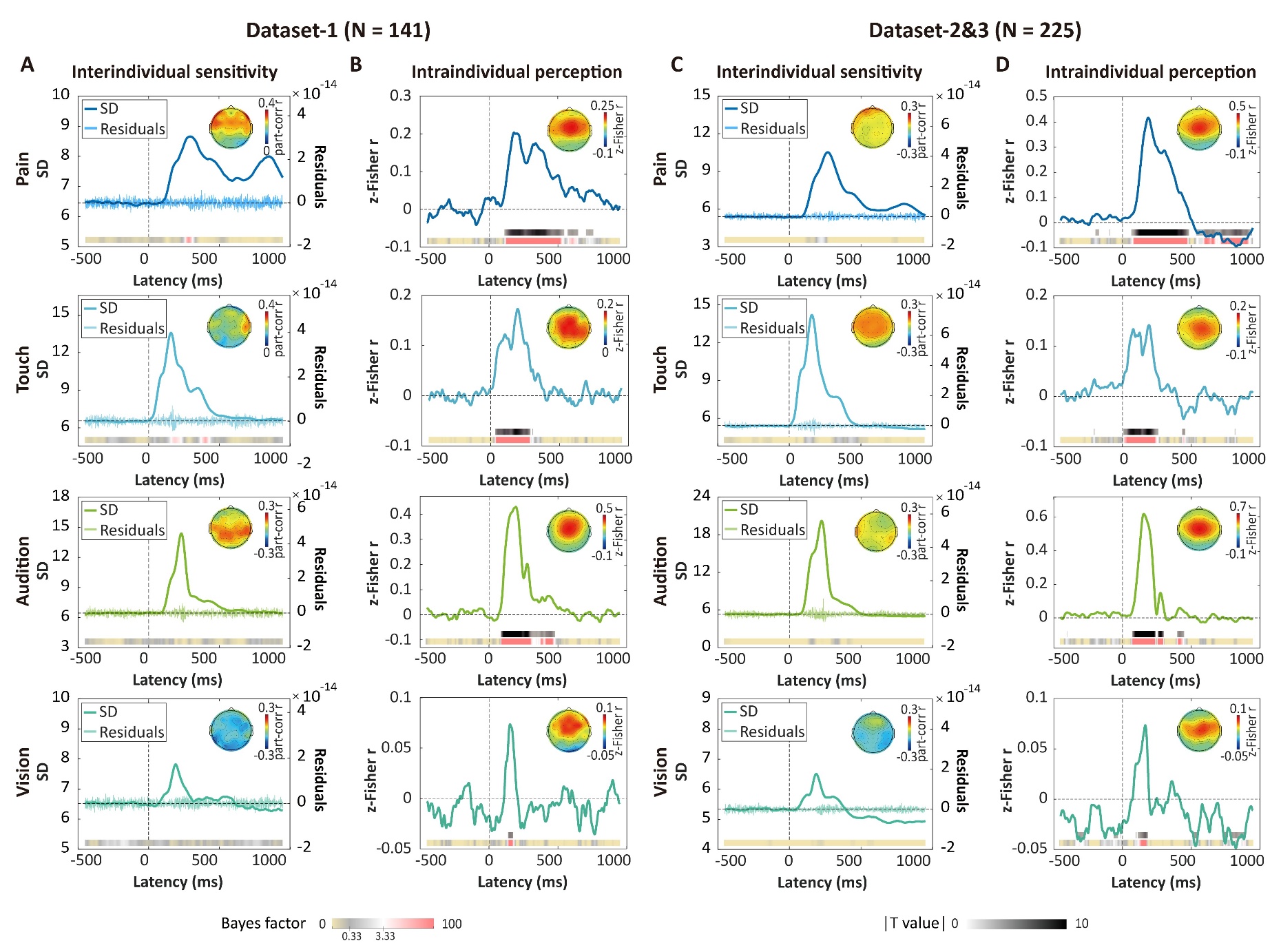 研究团队使用脑电信号在一定长度时间窗内的标准差作为神经变异性的主要度量指标(图1C)。疼痛感知则被区分为个体间和个体内两个方面:个体间疼痛感知表示疼痛感受性的个体差异,包括区分不同强度疼痛刺激的分辨力和感受单一强度疼痛刺激的敏感性;个体内疼痛感知代表个体对疼痛刺激的单试次状态性感知(Zhang et al., 2024)。分析显示,神经变异性和疼痛分辨力个体差异显著相关(图2;Dataset-1)。团队前期研究已发现N2、P2等脑电响应的强度可特异性编码疼痛分辨力的个体差异(Zhang et al., 2022)。排除了脑响应强度的影响后,研究团队发现神经变异性和疼痛分辨力仍有显著的偏相关。这意味着神经变异性可独立于神经响应强度编码疼痛分辨力。