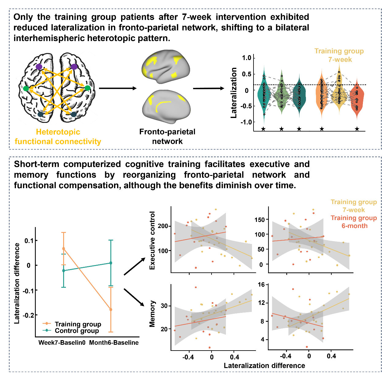 论文信息:Jin, X.#, Xing, Y.#, Lyu, B., Ding, J., Wang, X., Tang, Y.*, & Du, Y.* (2025). Cognitive training reorganizes lateralization of fronto-parietal network in vascular cognitive impairment. Brain Communications, fcaf394. https://doi.org/10.1093/braincomms/fcaf394