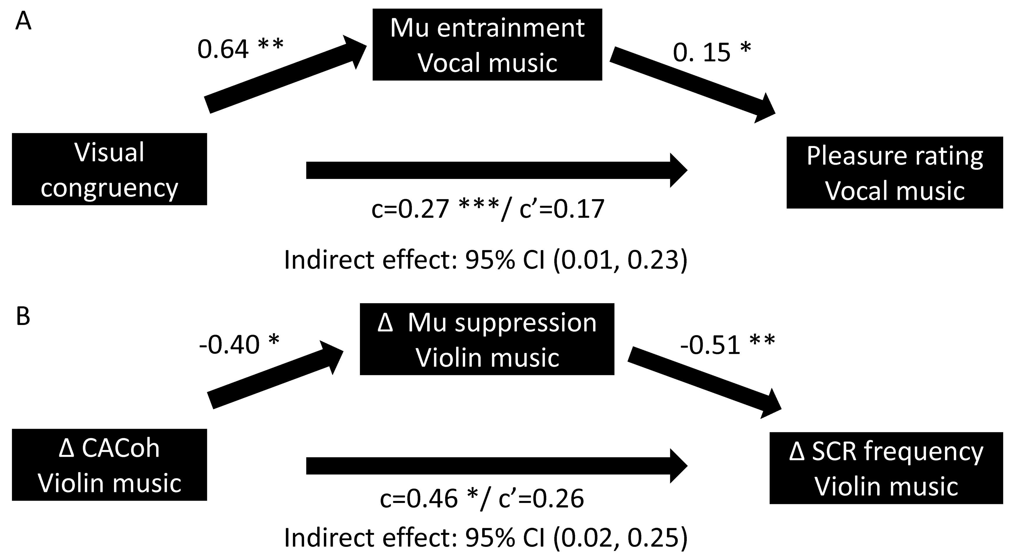 中介分析结果进一步发现,这种“Mu波同步”在视觉协调性对愉悦感的促进过程中起到关键的中介作用(图2)。