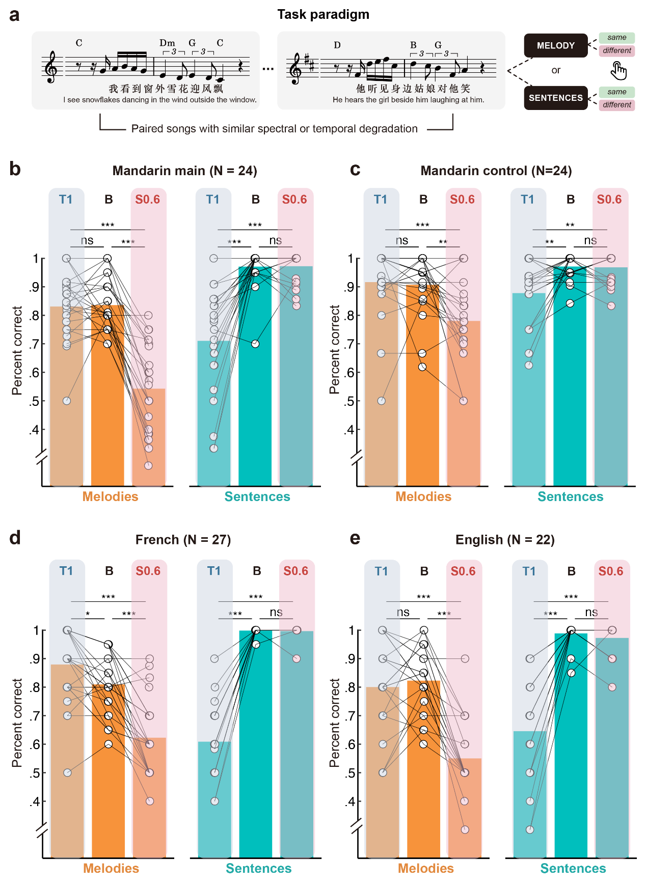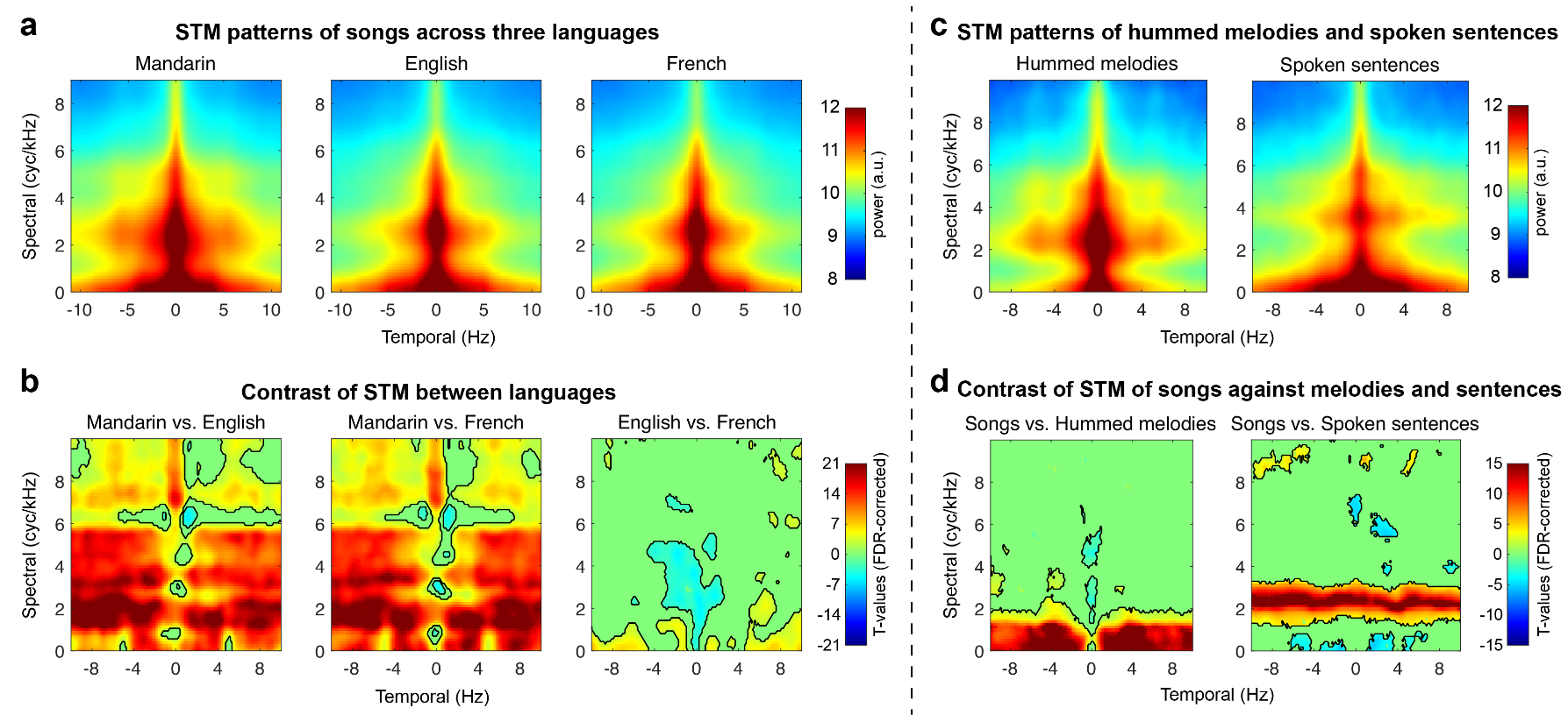 在日常交流与艺术欣赏中,人类能够轻松区分“说话”与“唱歌”,其关键线索在于声音在频谱(spectral)和时间(temporal)两个维度上的特征差异。在听觉研究领域,时频域调制(spectrotemporal modulation,STM)已成为分析语音和音乐声学特征的重要工具。已有研究表明,语音与旋律加工存在“不对称性”:旋律感知在频域信息分辨率降低时更容易受损,而语音感知则对时域信息的变化更为敏感(Albouy et al.,2020,Science)。近期研究还发现,STM能够有效区分不同文化背景下的歌曲特征(Albouy et al.,2024,Nature Communications)。然而,既有研究主要围绕非声调语言(如英语、法语)使用者开展,该机制是否适用于声调语言(如汉语)人群,目前尚未得到系统验证。