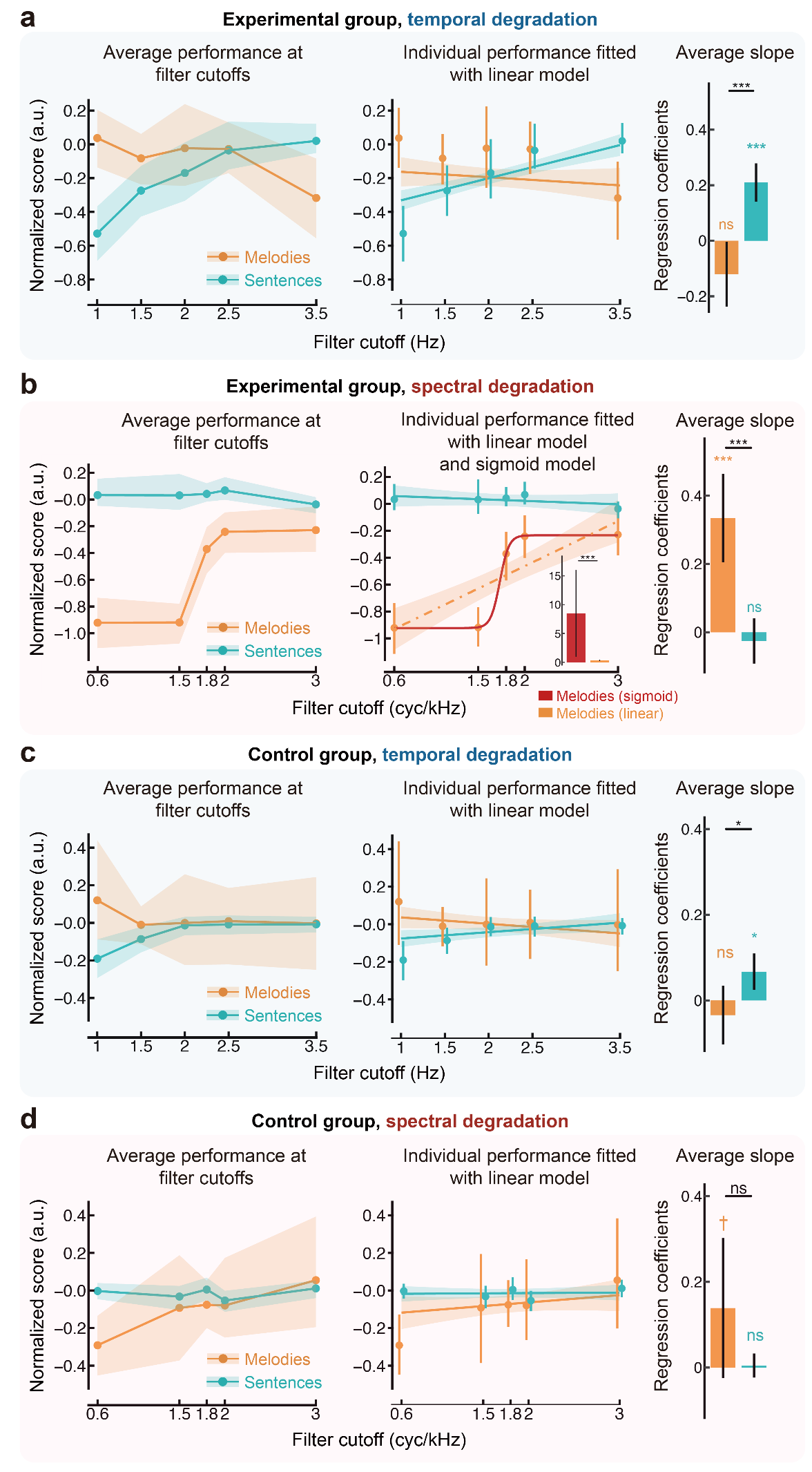图4. 汉语歌曲中在不同频域调制下的旋律和语音感知表现