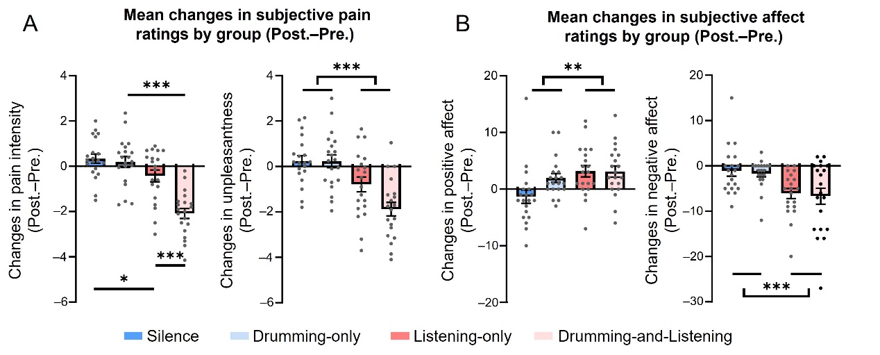 研究团队首先通过行为测量对比了不同干预方式对疼痛感知的影响。被试被随机分为四组:静坐组、单独击鼓组、单独聆听组、聆听与击鼓联合组。研究人员在干预前后,使用激光刺激诱发疼痛,并评估了被试疼痛强度与不愉悦程度的变化。结果显示,与单一干预或无干预相比,聆听与击鼓的联合干预产生了最显著的疼痛强度和不愉悦感降低。此外,所有包含聆听元素的组别(“单独聆听组”和“聆听与击鼓联合组”)在降低疼痛强度、减少不愉悦感以及改善情绪(即显著提升积极情绪、降低消极情绪)方面,均优于不含聆听的组别。这有力地表明,主动与节律同步的音乐互动,而非简单的被动聆听,能带来更强大的镇痛效果。