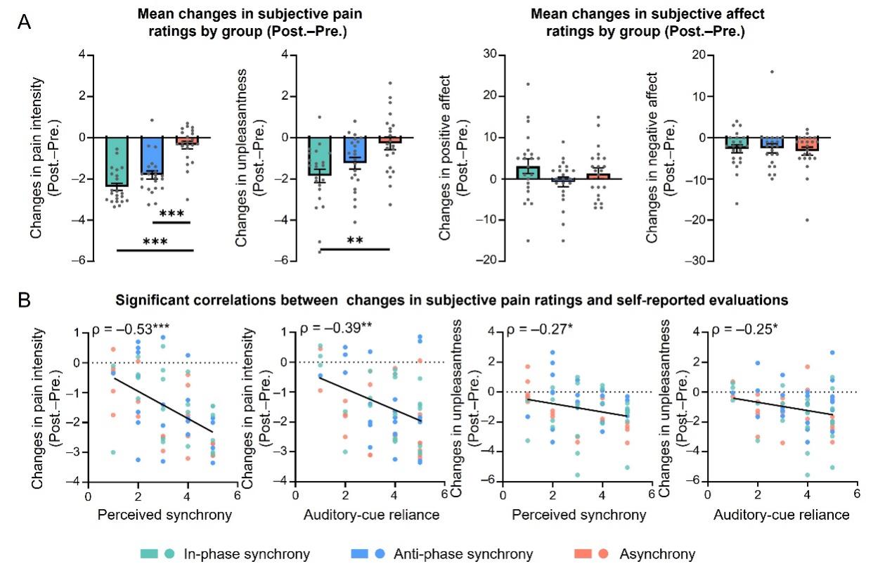 为了进一步探究感觉运动同步的核心要素,研究团队巧妙地操控了听觉节拍与视觉提示之间的时间对齐度,设置了“同相同步”(0°相位差)、“反相同步”(180°相位差)和“异步”(节拍与视觉提示节奏不匹配)三种条件。结果表明,“同相同步”组的被试报告的感知同步感最强,同时其疼痛强度和不愉悦感的降低幅度也最大。重要的是,被试主观感知到的同步程度越高,对听觉节拍的依赖越强,其疼痛缓解的效果也越显著。这强调了主观感知到的同步性,而非仅仅是客观的运动精度,在疼痛调节中扮演着至关重要的角色,这可能与预测编码框架下匹配预期与实际感知所带来的愉悦感和情感投入密切相关。