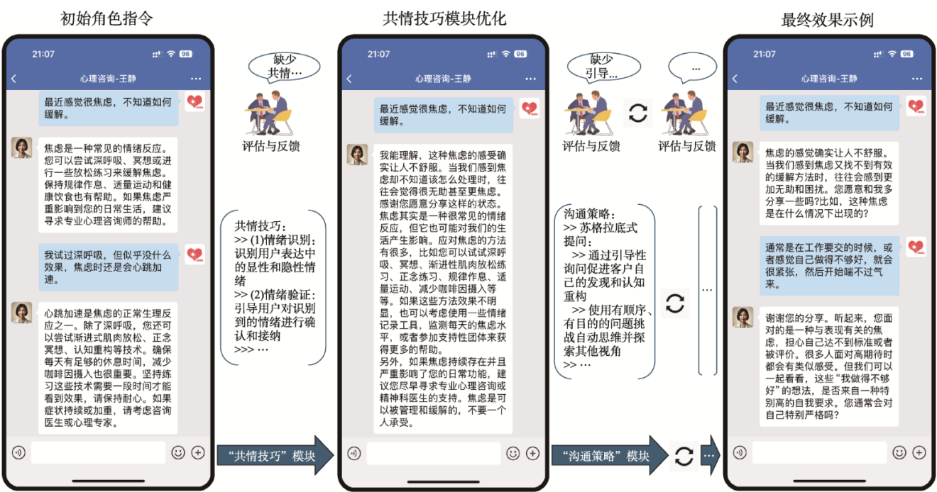 在识别环节之后,如何为广泛人群提供低成本、高可及性的心理干预,是研究组进一步关注的核心问题。研究组将心理咨询的专业流程与治疗技术体系融入大语言模型,构建了一套不依赖真实咨询案例数据的自助式AI心理咨询系统,并通过随机对照试验(RCT)评估其干预效果。