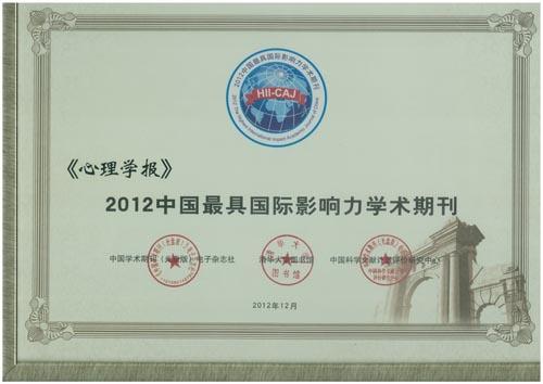 由清华大学图书馆、中国学术期刊电子出版社、中国科学文献计量评价研究中心联合,利用CAJ-IJCR (2012版),首次对中国 5025个学术期刊表现出来的国际影响力进行了评估。以2011年为统计年,根据学术期刊国际他引频次和国际他引影响因子由高到低排序,排在前 5%的被评为“2012中国最具国际影响力学术期刊”;排在前 5%—10%间的被评为“2012中国国际影响力优秀学术期刊”。心理所《心理科学进展》入选为“2012中国国际影响力优秀学术期刊”。《心理学报》入选为“2012中国最具国际影响力学术期刊”,并在5%的行列中排在前几名,也就是实际上属于顶端1%的行列。