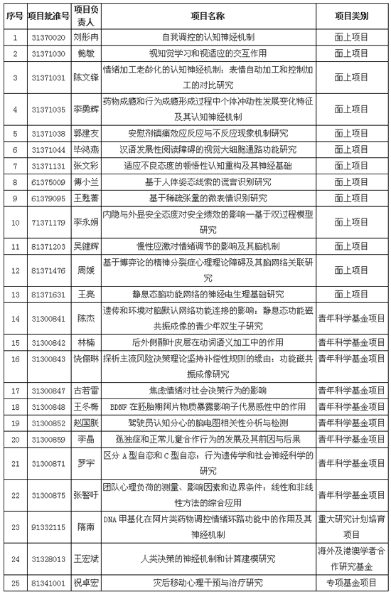 心理所2013 年度获批25项国家自然科学基金项目