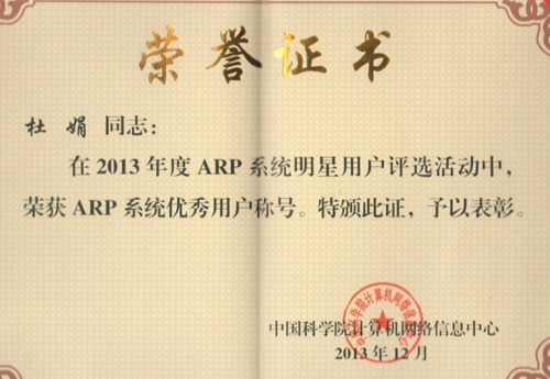 杜娟被评为中科院2013年度ARP系统优秀用户