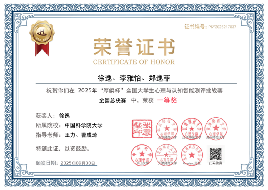 近期,首届“厚粲杯”全国大学生心理与认知智能测评挑战赛圆满落幕。中国科学院心理研究所组建七支优秀团队参赛,形成“本硕协同、多向突破”的科研矩阵,取得优异成绩。其中,“YI^3”团队创新制定了儿童创伤筛查表,荣获全国总决赛一等奖及分区赛二等奖;“纸上心语”团队构建基于自由文本的抑郁风险预测模型,获分区赛三等奖;多支参赛队伍斩获校赛奖项。