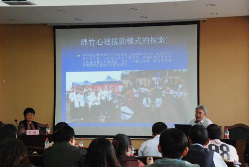 另外,来自各地的心理援助志愿者特别是曾经在绵阳北川工作站、北川中学工作站、绵竹工作站、舟曲工作站、什邡工作站工作过的志愿者,开展了心理援助过去、现在和未来的主题讨论与经验分享。北川工作站站长史占彪教授与北川志愿者一起回顾了“从永安到永兴,从永兴到永昌”开展五年心理援助的心路历程;北川中学工作站站长龙迪和志愿者一起开展了“聚是一团火,散是满天星——相遇北川中学的生命印迹”回顾研讨;绵竹工作站站长祝卓宏博士做了题为“从绵竹到金色阳光工程”的报告,回顾了绵竹工作站的工作经验和后续推广应用,并对志愿者做了心理急救原则与实施的讲座;舟曲工作站副站长郭永明做了“大爱之舟, 共谱心曲——舟曲圆心曲社会心理服务中心几点做法”的经验分享报告;什邡工作站副站长肖尤泽分享了他们五年来在什邡灾后开展心理援助服务本土化的探索。