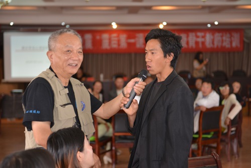 培训中,中国心理学会心理危机干预工作委员会委员、心理所灾害心理援助与创伤研究青年创新团队成员陶勑恒教授、心理所抚顺灾后心理援助工作站志愿者白云阁和心理所北川灾后心理援助工作站志愿者于洋开展了心理危机干预的理论授课、体验式教学、“震后第一课”课程设计和现场示范等培训。陶勑恒教授首先提出了“震后第一课”与“震后第一堂课”的区别,指出“震后第一课”是指震后学生、教师度过应急期过程中的心理工作,“震后第一堂课”是指震后学生所上的第一堂心理课,是“震后第一课”的重要组成部分。随后,在白云阁和于洋的协助下,陶勑恒通过“大风吹”、“映山红开”等热身活动示范了如何面向灾区学生开展团队建设活动,讲授了学校心理危机干预理论和实践,开展了以“压力管理”为主题的团体辅导示范课,并通过对培训主题的确定、培训时间的把控、热身活动的开展、进入主题环节的方式、参与者分享的开展、进行主题升华等具体心理健康课程流程的示范和讲解,辅之以小组讨论的形式进行了现场课程设计和实施,提升了参训教师运用理论和进行迁移的能力。