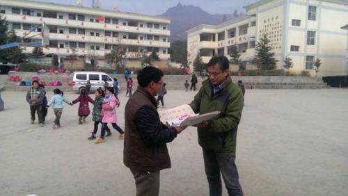 张建新研究员向乐红中心小学党委书记赠送新年礼物