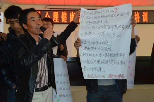 培训通过参与式授课和实践操作相结合的方式进行。在授课环节,陶勑恒教授对学校心理健康教育的基本途径、心理健康教育课程的基本理念与设计作了讲解,阐述了以人为本的心理健康教育原则,提出“原则比技术重要”的思想,对中小学心理健康教育的理念做了深层次的剖析。杨伟从心理健康课的准备、现场演练、操作方法做了现场示范,讲解了中小学心理健康课从设计到实施和研讨的具体操作流程,使参训教师学习到了中小学心理健康课程的具体操作技能。参训的心理健康骨干教师对中小学心理健康教育从理念到可操作性上都有了清晰的认识和体验。培训结束后,陶勑恒教授同杨伟又来到心理援助工作站龙泉中学示范校开展了一堂主题心理辅导课,更进一步地增强了大家对从事心理健康教育和开设心理健康课程的理解。
