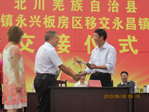 带着这样充满感情的复杂情绪,仪式在场所有人员迎来了激动人心的一刻。中共北川羌族自治县曲山镇人民政府李华镇长和永昌镇人民政府邓宏镇长签署了《北川羌族自治县曲山镇管理的永兴板房区移交永昌镇管理交接备忘录》,中共北川羌族自治县永昌镇党委书记赵显福同志为永昌镇永兴板房区临时党总支委员会授牌,中共北川羌族自治县永昌镇镇长邓宏同志为永昌镇永兴板房临时管理委员会授牌、授印。一系列的移交程序完成后,曲山镇永兴板房区就将正式移交给永昌镇管理了,在场的许多群众激动得落下了眼泪。最后,中共北川羌族自治县县委副书记翟永安同志致辞,他对交接仪式的顺利结束表示祝贺,对永昌镇接管后的工作进行了展望,并表示美好的期望和相应要求。
