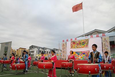 在晚会上,击鼓队强劲整齐的鼓声响彻校园,精彩的演出拉开序幕。
